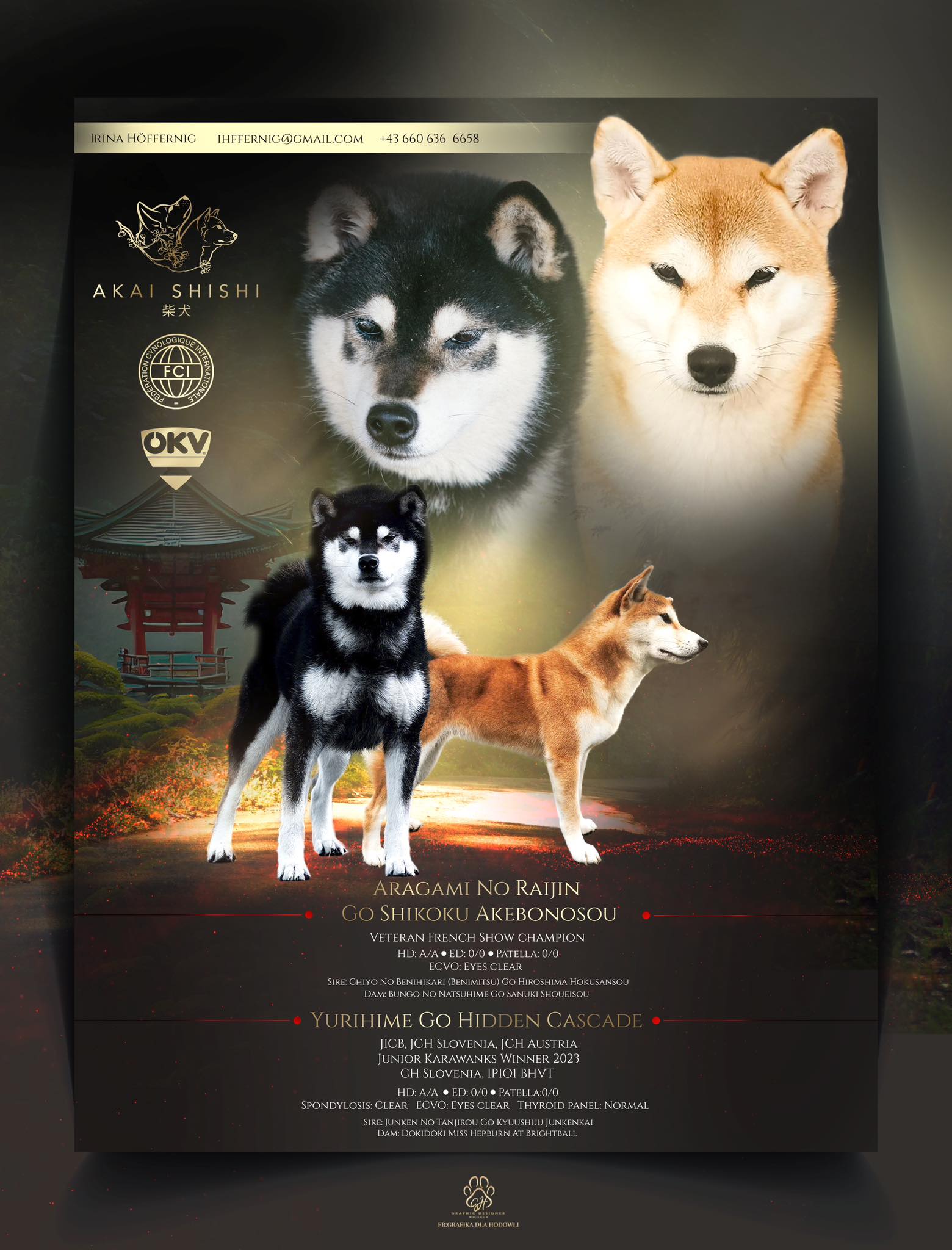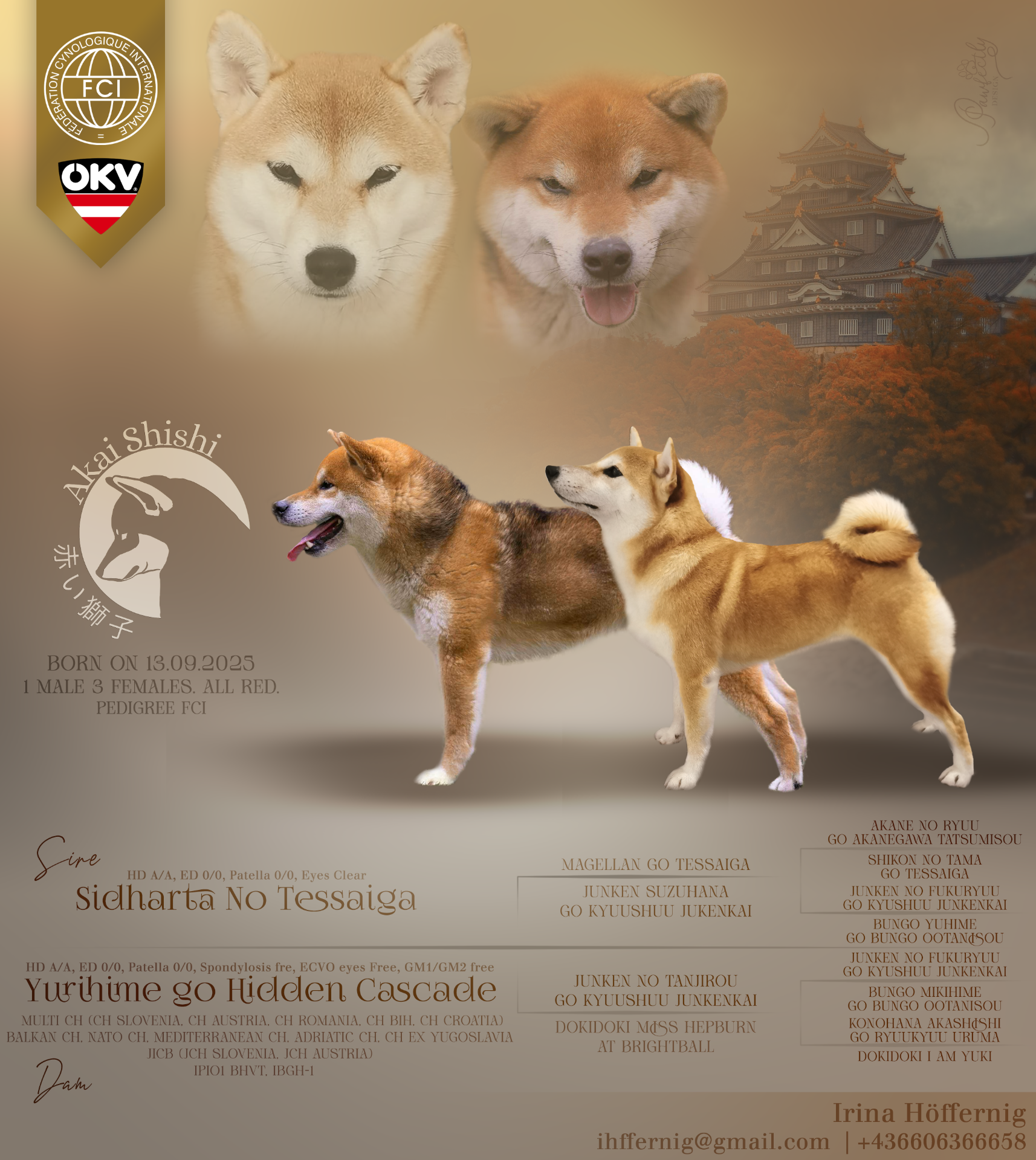 My name is Irina, a long-term dog lover and enthusiast. Located in Villach, the south of beautiful Austria. I started working with dogs over 20 years ago. After the passing of my first dog, a rescue mutt, in 2019, I was looking into a potential new companion and came upon the Shiba, as the breed's temperament and constitution intrigued me. My first Shiba, a male named Akiro, came to me in late 2019, and I was hooked. Because reading or hearing about them is different from living with them. And since I got hooked on them myself, I wanted to spend my time preserving their unique nature, health, and temperament for the future and sharing it with fellow Shiba enthusiasts. This meant starting my own kennel, ‘Akai Shishi’ or the red beasts, in 2024, which is registered with the ÖKV and NIPPO. My goal is to raise stable, healthy, and sound dogs that can shine in the show ring as well as in any other sport or situation you put them in. This means I am exceptionally picky when it comes to dogs that enter my breeding program. Only dogs that meet my expectations in health, temperament, and workability are suitable to be carrying on this name.